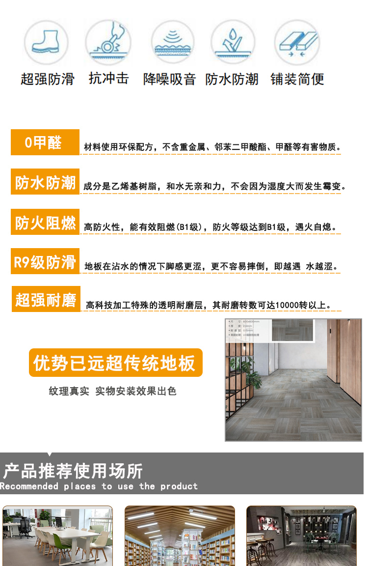 介紹:PVC石塑地板即LVT石塑地板,指的是PVC片材地板,因為PVC片材地板主要原料是天然石粉,耐磨層是PVC材質,因 此起名叫“石塑地板”或“石塑地磚”。 花紋分為仿木紋,仿石紋,仿地毯紋,環保耐磨,防水防滑,防火阻燃,花紋眾多,可塑性強,安裝快速方便等優勢,已經替代了市場上很大部分強化木地板。